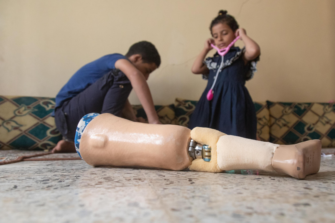 「りゅう散弾でこことここを怪我したの」とアラーは自分の足を指して語ります。兄のアハメドに病院に連れて行かれたアラーは、足を切断されました。その後、義足を装着し、ICRCが支援するイエメン南西部の古都タイズのリハビリ施設で理学療法を受けたことで、歩行し、自分で何でもできるようになりました。