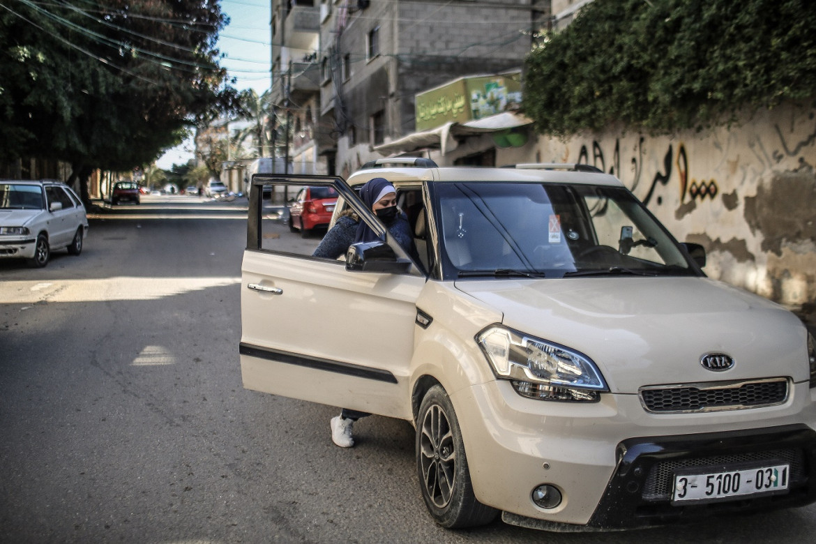 「コロナ禍では、感染拡大防止の一環として、公共交通機関の運行が停止となりました。そのため、ガザで暮らす人々、特に女性は、移動することが困難になりました。そこで、そうした人々を助けたいと思い、自家用車を利用して、タクシーサービスを始めました」と語るのは、女性と子ども専用タクシーの運転手として働く、39歳のナエラ。