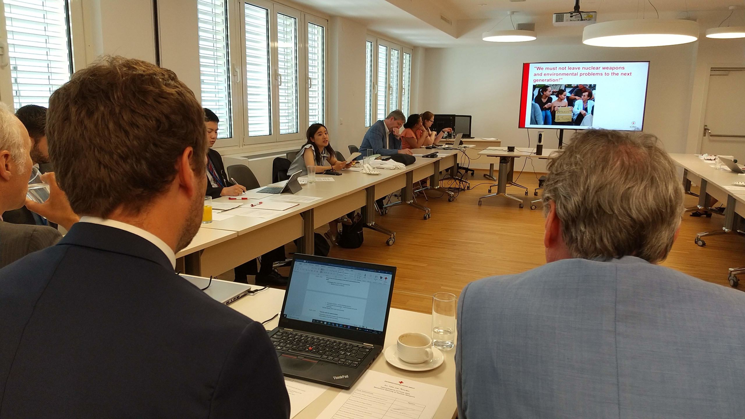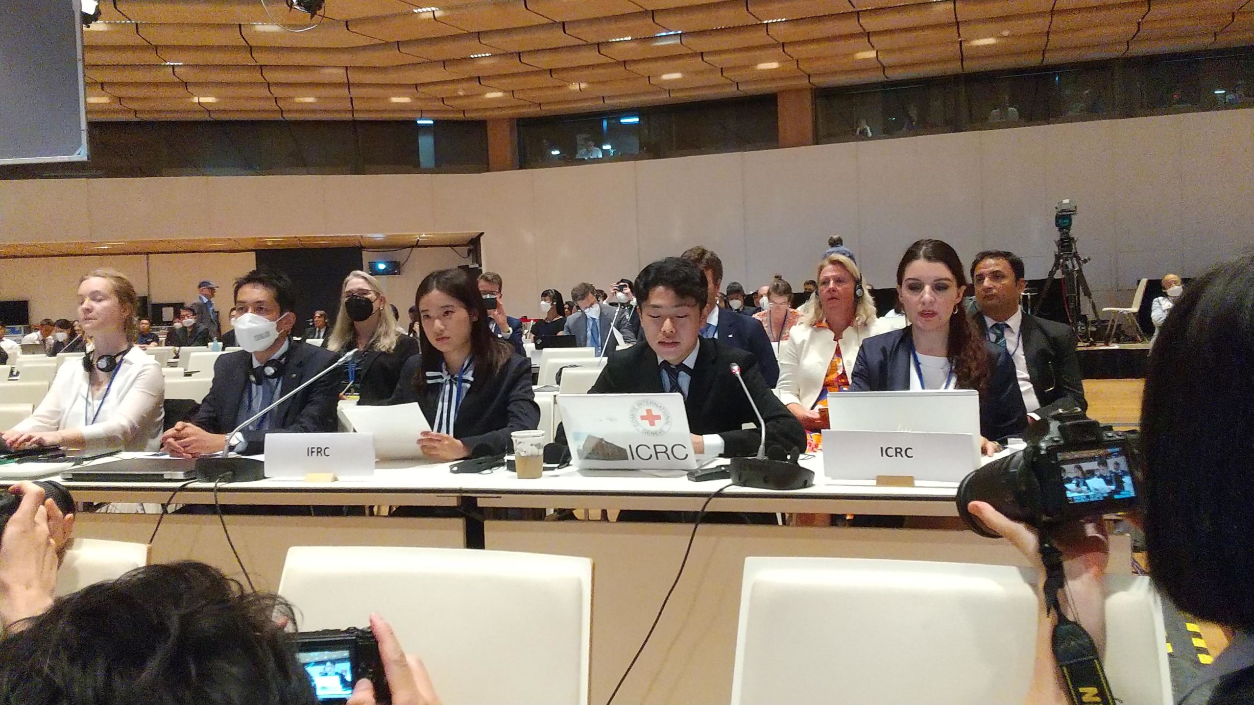 また、会議の中でICRCは、条約の履行と今回の会議の成果を見据えて、締約国に対する具体的な勧告を盛り込んだ文書を提出。提出した複数の勧告文書のうち、2日目の議題「被害者支援、環境修復と国際協力・援助」には、髙垣と奥野がそれぞれ事前に用意していた文言も綴られました。その該当箇所を口頭で発表した二人は、議場で堂々と国際社会の結束を訴えました。