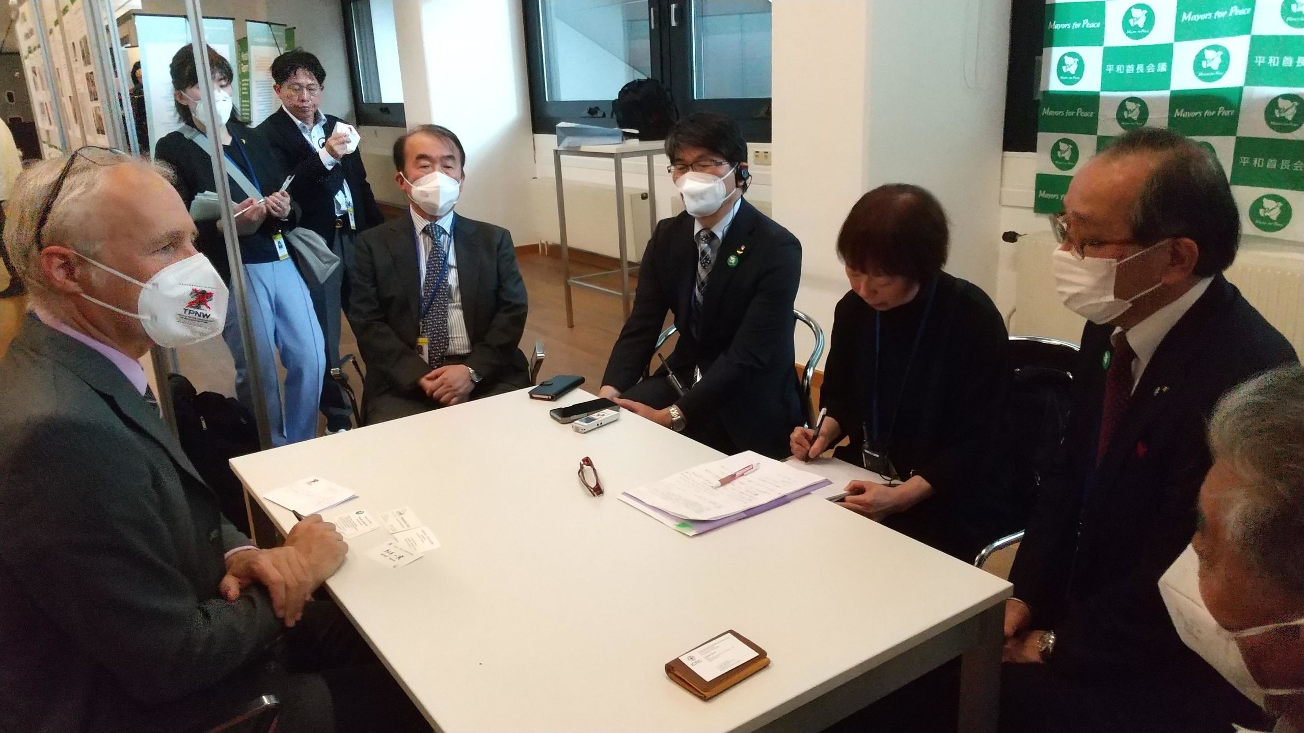 本会議場の外では人道外交も。平和首長会議のブースで、ICRC軍事兵器部門責任者が広島・長崎両市長と会談 🄫ICRC