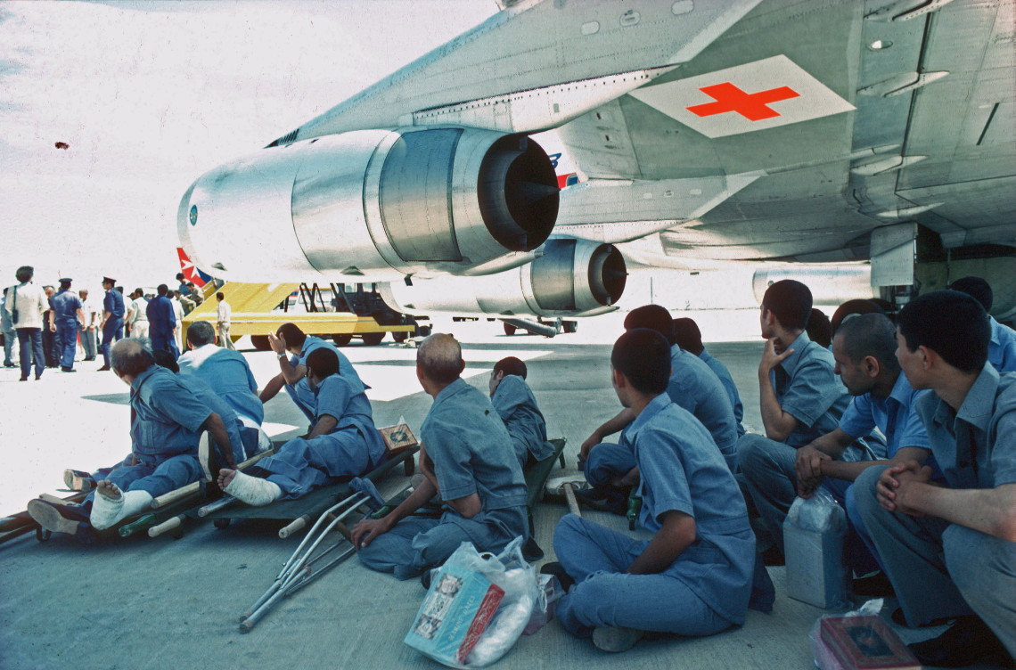 1981年6月6日、キプロス、ラルナカ空港で、ICRCは重傷のイラン人捕虜25人を本国へ送還。ICRCはイラン・イラク紛争の間も、捕虜の送還に積極的な役割を果たしていた。©Thierry Gassmann/ICRC