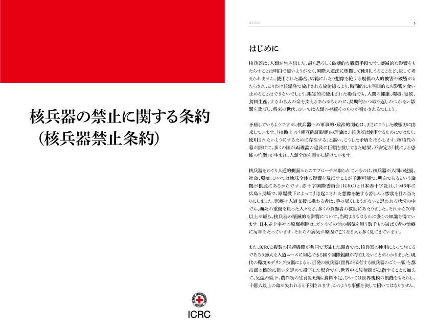 条約は、核兵器の使用や実験が人道上与える壊滅的な被害などを盛り込んだ、国際人道法上初の法律文書で、その発効は、広島と長崎の惨劇を目の当たりにした赤十字の宿願でもありました。条約の条文には、国際人道法の守護者でもある赤十字の今後の役割や貢献も明記されています。